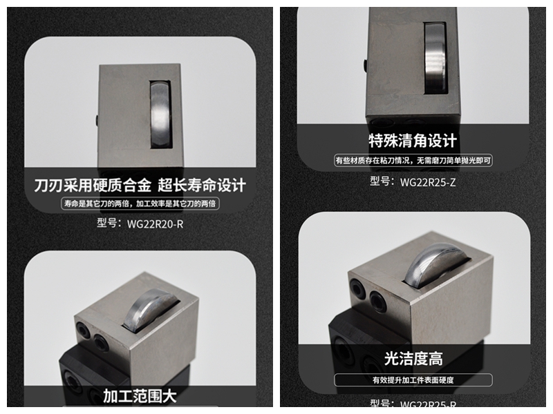 本工具適合Φ5以上的光軸光桿外圓,工具的通用性強(qiáng),使用壽命長(zhǎng),加工方便。刀具有正,反兩種結(jié)構(gòu),可根據(jù)滾壓工件直徑的大小選擇合適的滾輪直徑,可加工出最佳的鏡面效果。